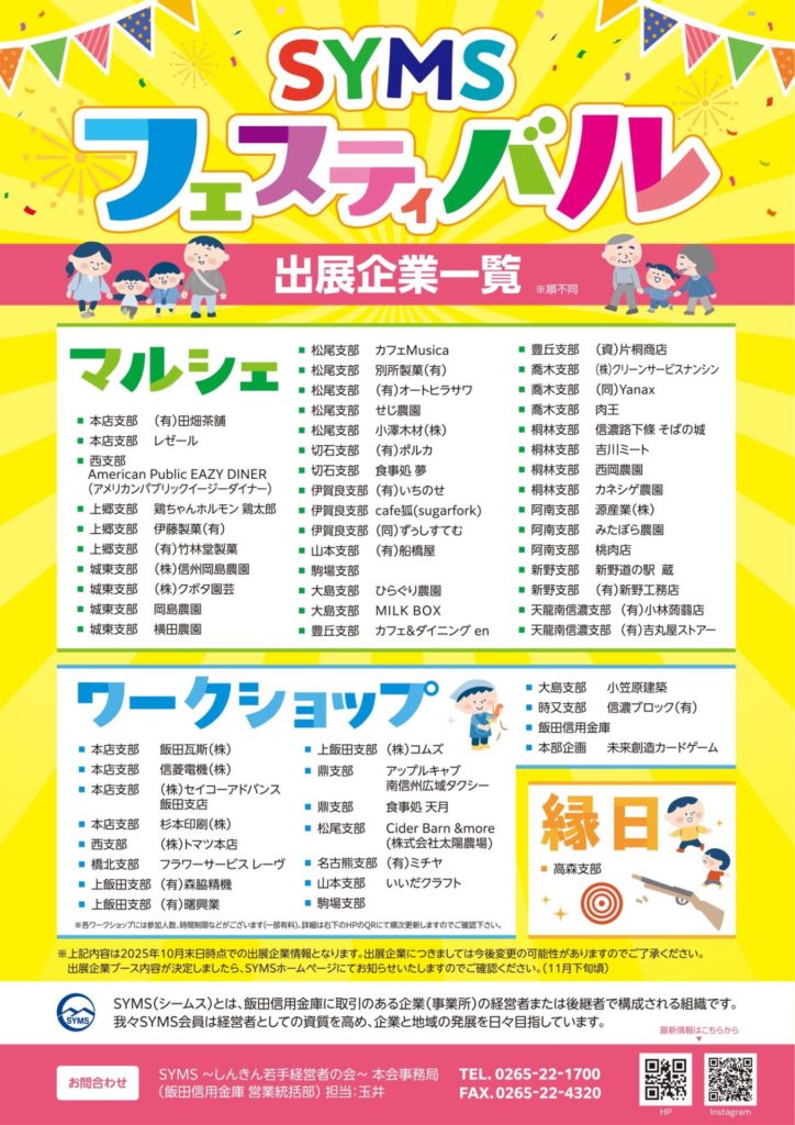 SYMS(シームス)は飯田信金しんきん若手経営者の会です。飯田下伊那からたくさん自慢の品が集まります。マルシェのほかにも様々な体験ができるワークショップや、お子様も楽しめる縁日など、内容もりだくさん! お近くの方はぜひ足をお運びください