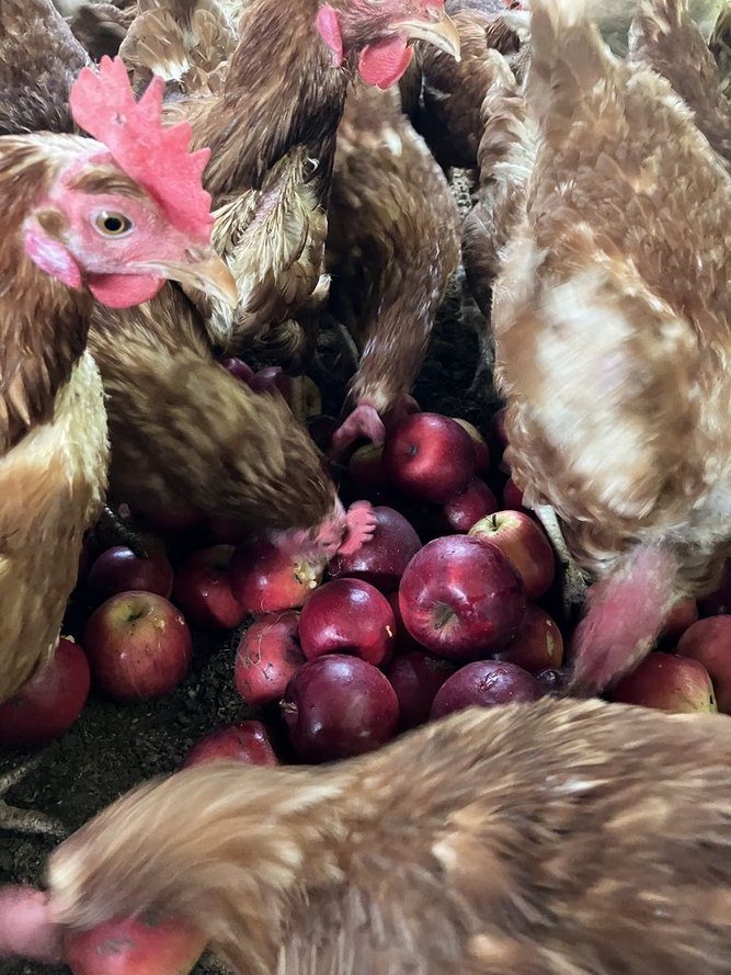 近所のりんご農家さんから、落下りんご(収穫前に木から落ちてしまったりんご)をいただきました。さっそく鶏たちに挙げてみると、駆け寄ってきて我先にと食べています。