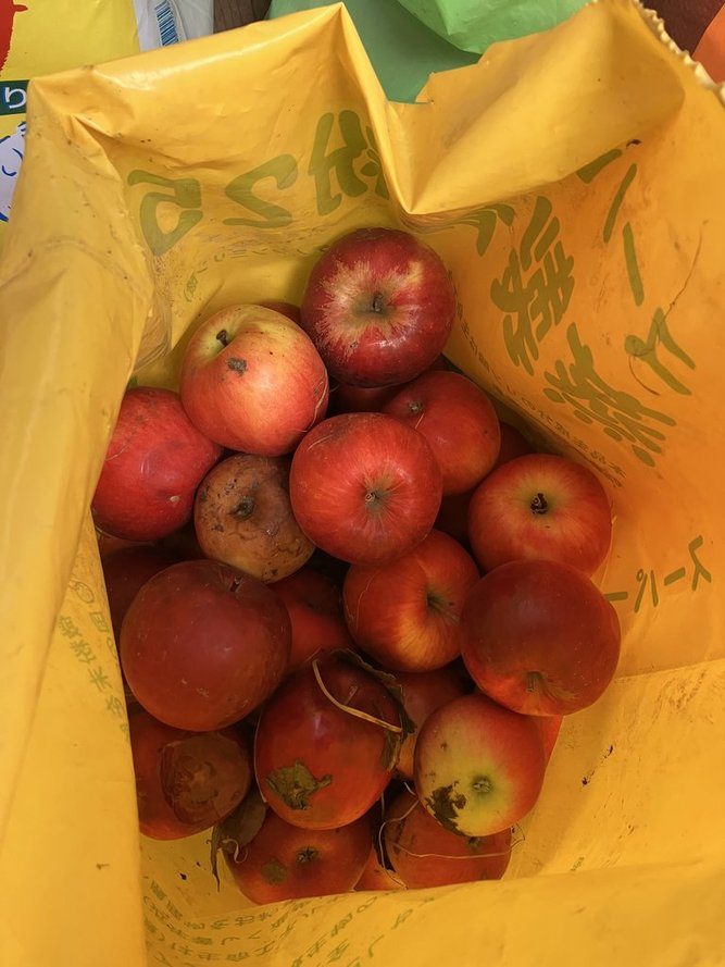 今年は夏の高温の影響もあり、木から落ちてしまう実が多いとのこと。傷がついていますが、鶏にやるには何の問題もないものばかりです。そして、そのまま果樹園に置いておくと熊をおびき寄せてしまう懸念もあるとのことで、軽トラに積んで持ってきてくださいました。